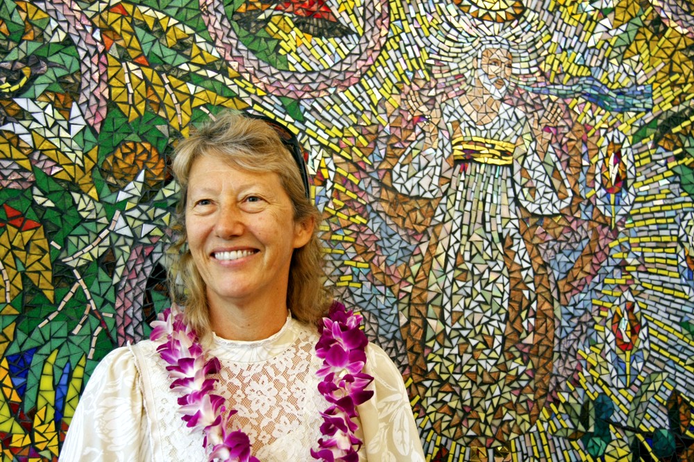 Local artist Karen Lucas stands in front of her mosaic, “Jesus in Hawaii,” during its unveiling at Saint Louis School, April 9.