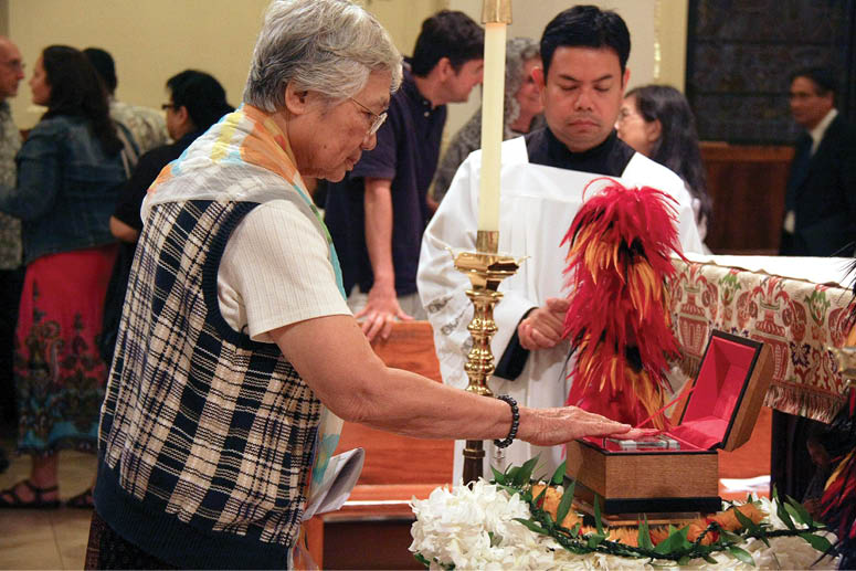 The liturgy opened with an oli, a Hawaiian chant, by the Royal Order of Kamehameha I. A relic of St. Damien was placed in front of the altar where, after Mass, it was venerated by the faithful.