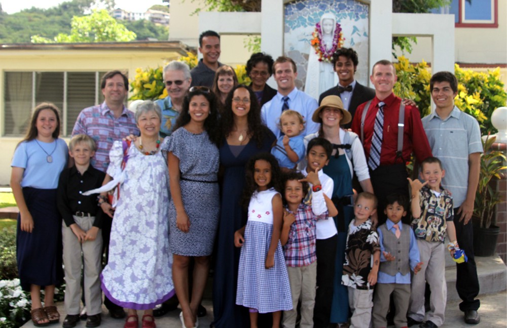 Members of the Latin Mass Community of Blessed Sacrament Parish in Pauoa Valley pose for a photo outside of church. The pastor, Father Steve Nguyen, celebrates what is also referred to as the “extraordinary form of the Roman Rite” on Sundays at 10 a.m. Latin-to-English translation missalettes help the congregation follow along. The Mass is often followed with refreshments. Bishop Larry Silva will administer the sacrament of Confirmation to members of the community on Aug. 18. (Photo courtesy of Rick Fucini)