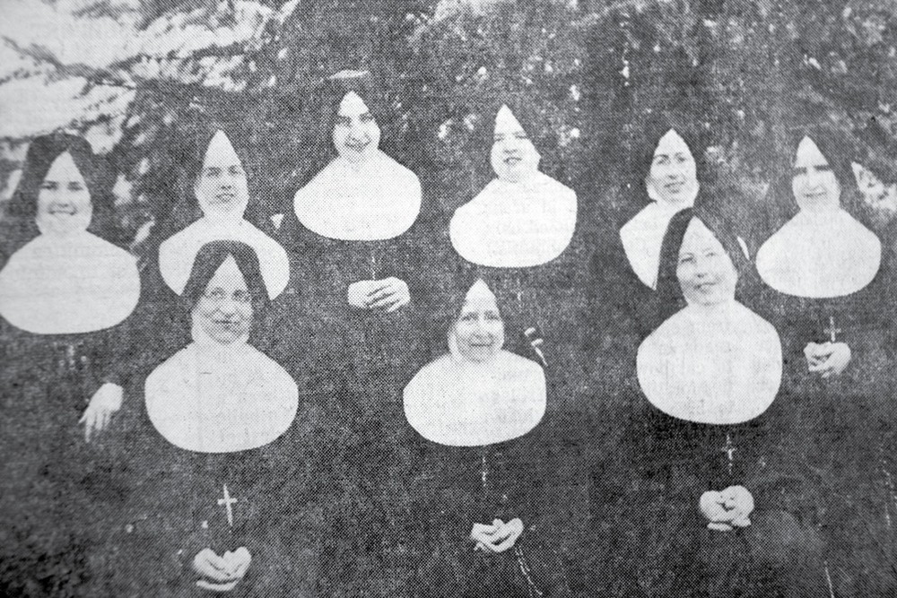 In the history of the Sisters of St. Joseph of Carondelet in Hawaii, there was a first family — the first group of nine nuns who arrived twenty-five years ago to establish themselves in the islands at St. Theresa’s School. For thousands of parents and children the names of these nine nuns became well known and the nuns well loved. That first family in August 1938 included: (seated left to right), Sister Zanaide, Mother Virginia, and Sister M. Faber; (standing left to right), Sister Ann Patrice, Sister Frances Celine, Sister Alice Josephine, Sister Mary Anne, Sister Adele Marie, and Sister M. Felix.