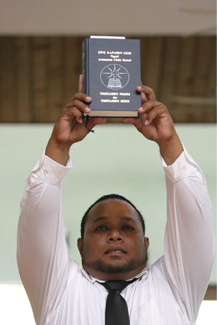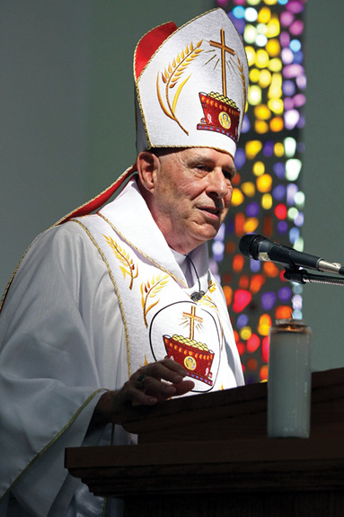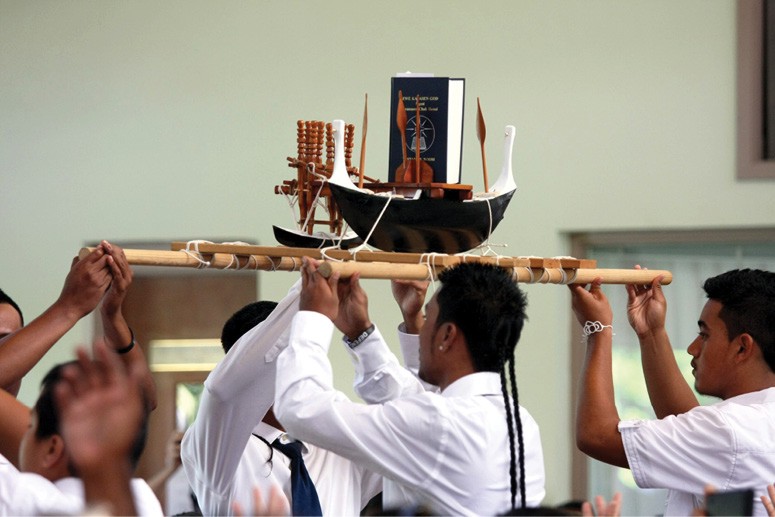 Bishop Larry Silva, far left, celebrated Mass for the Chuukese Catholic community Aug. 18. The liturgy, which is celebrated in English with readings and music in Micronesian languages, regularly draws hundreds of congregants to St. Philomena Church in Honolulu every third Sunday of the month. At the Aug. 18 Mass, Micronesian Catholics welcomed the bishop with cultural presentations. (HCH photos | Darlene Dela Cruz)