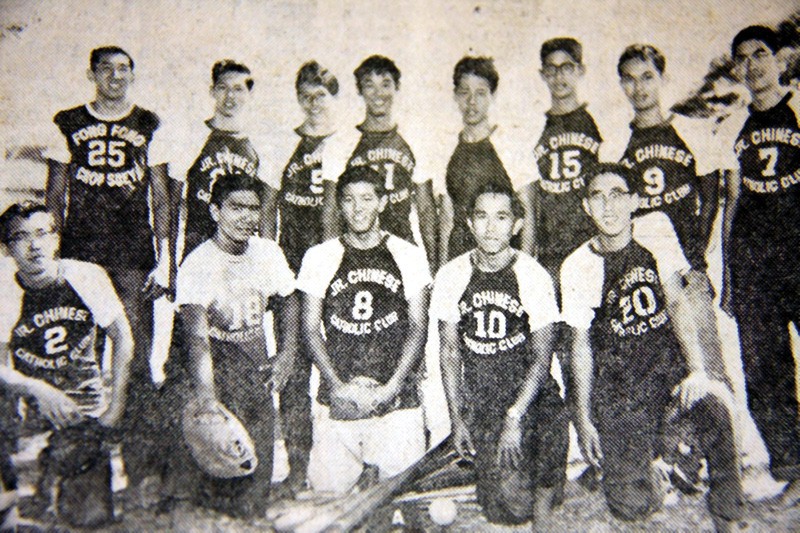 Members of the Junior Chinese Catholic Club pose for this final picture of the year as they end the CYO Junior Softball circuit as the champs. In the front row, left to right, are James Araki, Peter Estomogo, Raymond Lum, Joseph Calizar, Michael Chu. Standing, left to right, are Rodney Go, Lowell Tong, Gary Chang, Melvin Leong, Alton Wong, Wayne Leong, Patrick Calizar and Patrick Bourke.