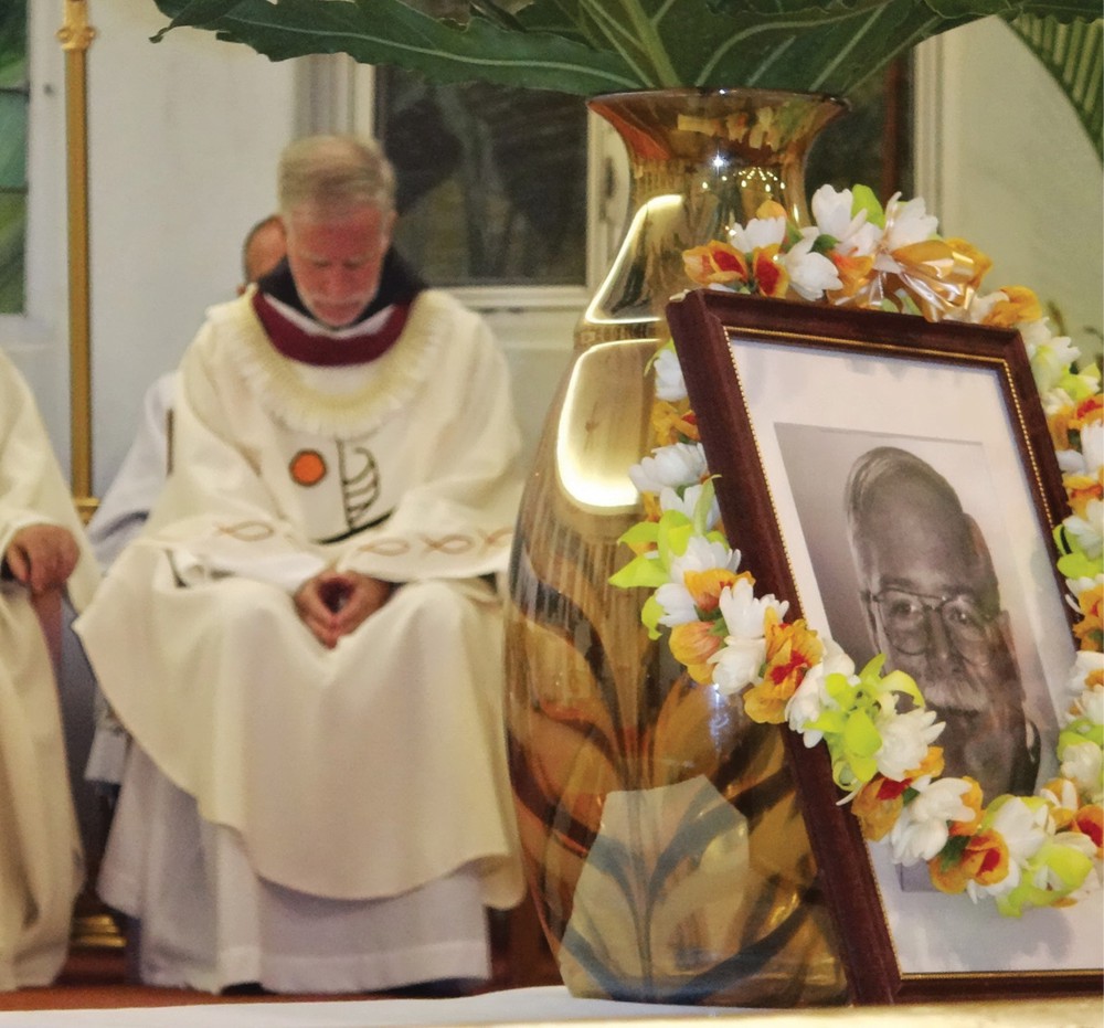 Capuchin Franciscan Father Michel Dalton prays after Communion in St. Elizabeth Church, Aiea, at an Aug. 29 memorial Mass for Capuchin Father Robert Maher, pictured in the framed photo, a former Oahu parish priest who died on the mainland on Aug. 20 at age 66. Bishop Larry Silva celebrated the Mass with Capuchin Fathers Paulo Kosaka and Gordon Combs and several diocesan clergy. Father Maher served at St. Elizabeth from 1997 to 2007, at Our Lady of Mount Carmel Church in Waikane from 2008 to 2009 and was administrator of St. George Parish in Waimanalo from 2009 to 2012. Father Dalton, pastor of Immaculate Conception Parish, Ewa, and former pastor at St. Elizabeth, gave the homily at the memorial Mass. At the conclusion of the Mass, the Capuchins sang the traditional Franciscan hymn for a happy death dedicated to the Blessed Virgin Mary. Father Maher’s funeral Mass was celebrated Aug. 24 at Sacred Heart Church, Yonkers, N.Y. (Photo courtesy of St. Elizabeth Church)