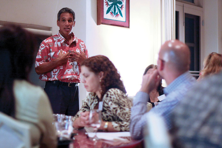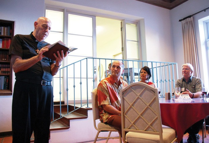 Bishop Larry Silva hosted the diocese’s first ever gathering for “Catholic professionals” Sept. 20 at St. Stephen Diocesan Center. The event, planned by the diocese’s Year of Faith committee, drew about 30 participants from various community sectors for a night of food and faith-sharing. In top photo, diocesan vicar general Father Gary Secor, left, led a group discussion with attorneys Shawn Luiz, Bruce Graham and Bonnie Moore. Below, former lieutenant governor Duke Aiona shared a personal reflection. Richard Meiers of Hawaii News Now and his wife Theresa, along with Jim Dannemiller, listened as Bishop Silva, bottom right photo, read a Scripture passage. (HCH photos | Darlene Dela Cruz)