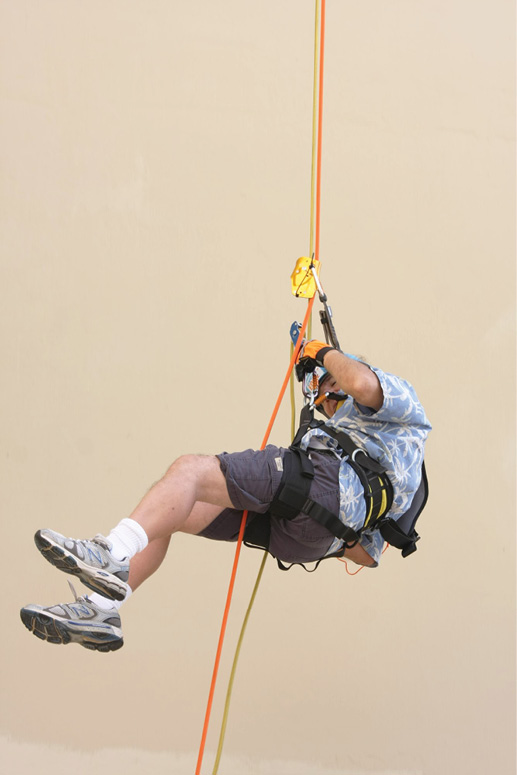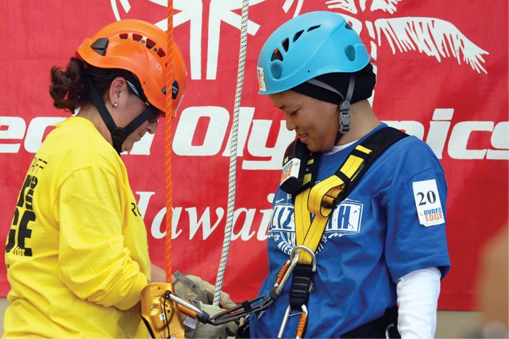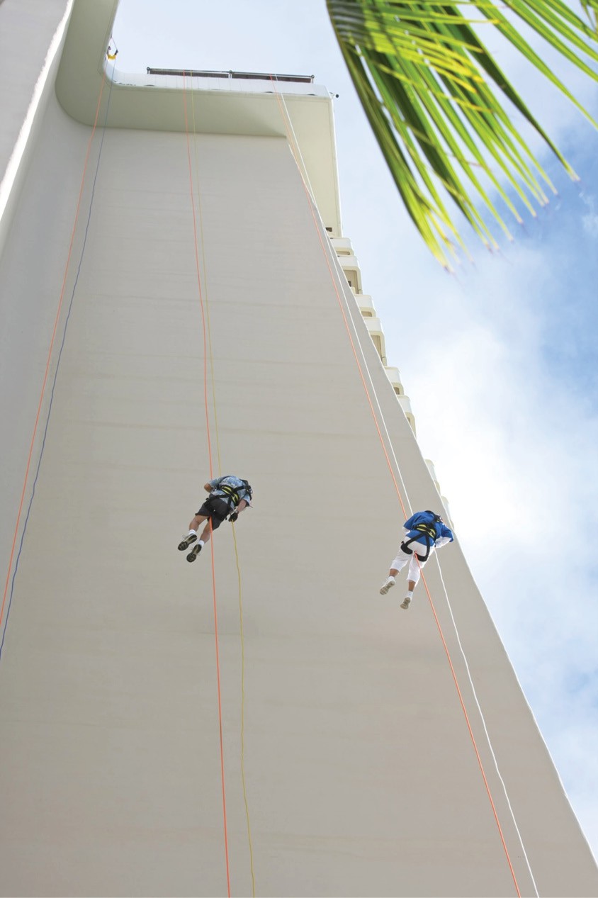 Father Arnold Ortiz of the Oblates of St. Joseph and Sister Ruth Zonunthari of the Missionary Sisters of Mary Help of Christians rappelled down the Sheraton Waikiki Hotel Nov. 2 as part of the “Over the Edge” fundraiser for Special Olympics Hawaii. Parishioners from St. Elizabeth Church in Aiea, where Father Ortiz is administrator and Sister Ruth works, were on hand to witness the priest’s and nun’s descent down the building’s 31 stories. (HCH photo | Darlene Dela Cruz)