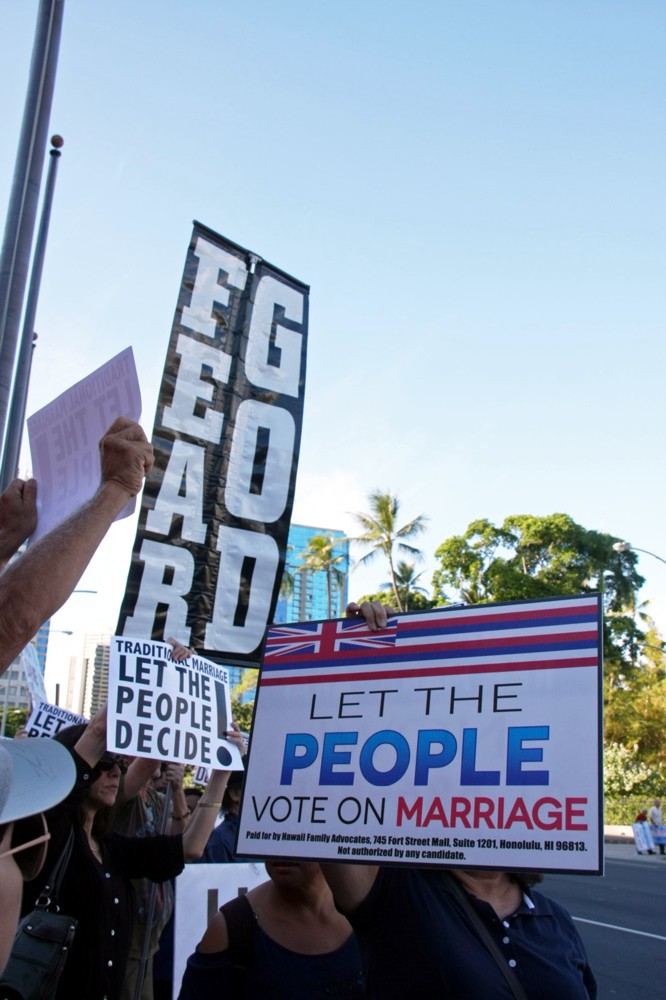 State officials stepped in to sidetrack the ideological battle from getting dangerous, setting up barricades to corral the two sides into their respective corners. I think that was a bit of an infringement on freedom of speech, especially when officialdom tried to set limits on who occupies what Beretania Street curbside space. But, hey, I do see it could have degenerated into a security nightmare, and I imagine that’s why Gov. Neil Abercrombie decided to do his ceremonial bill-signing thing away from the Capitol.