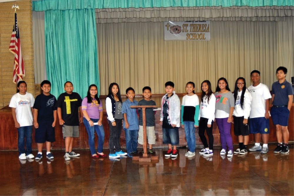 D-I-A-D-E-M was the word that brought fifth grader Jordan Calantoc, center behind the podium, to victory at the third annual spelling bee at St. Theresa School in Honolulu. The two top spellers from each grade participated in the school’s overall competition on Nov. 13. Jordan will move on to the district’s Spelling Bee and, if he wins, to the state contest. Pictured from left are contestants, Joyce Caberto, Zachary Valdez, Ramon Hernando, Tyler Caro, Reanelle Lao, Magnus Ricafort, Dylan Dinio, Chloe Popa, Michaela Dolor, Angela Faye Navor, Annjohnette Tubera, Kyle Pizarro and Justice Cabantangan. (Photo courtesy of Bernie Gora)