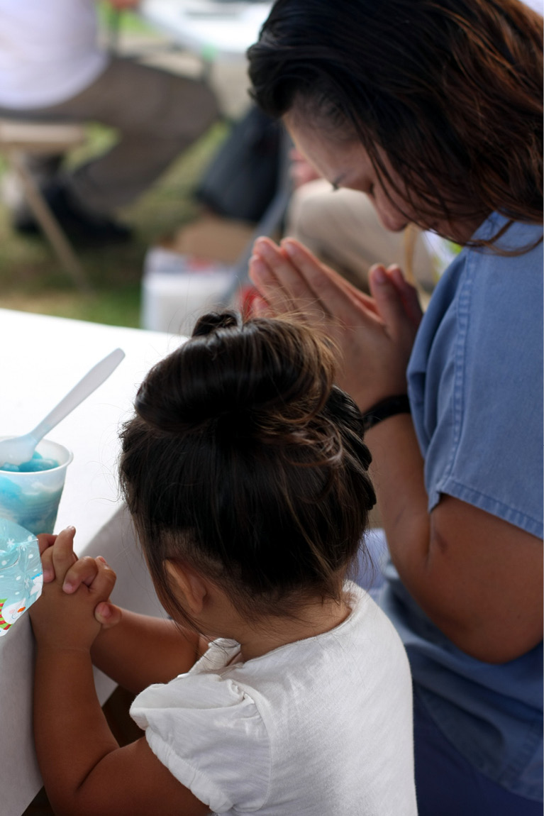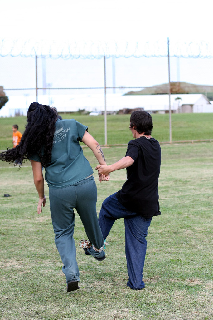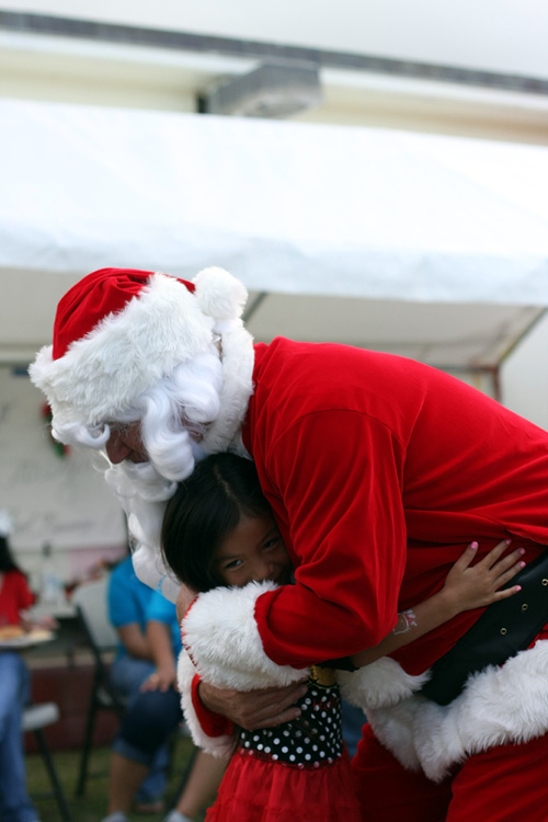 The diocesan prison ministry held their annual Star Light, Star Bright Christmas party for women inmates and their families at the Women’s Community Correctional Center in Kailua, Dec. 14. The party featured games, karaoke, food, donated gifts and a visit from Santa. From top, an inmate and child pray before lunch; Deacon Richard Abel, dressed as Santa Claus, hugs a child; a family tries out a “three-legged race” game. (Photos by Darlene Dela Cruz)