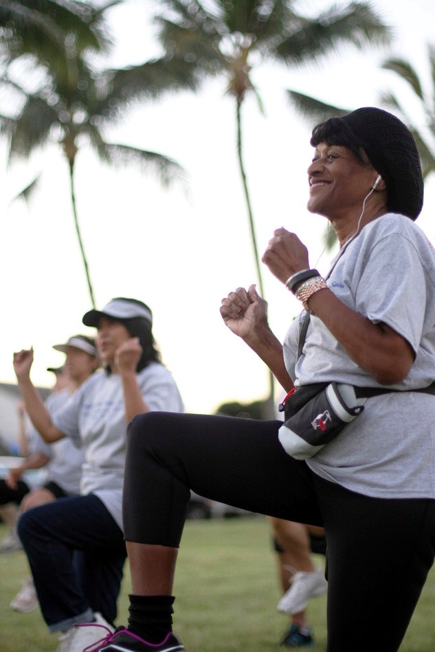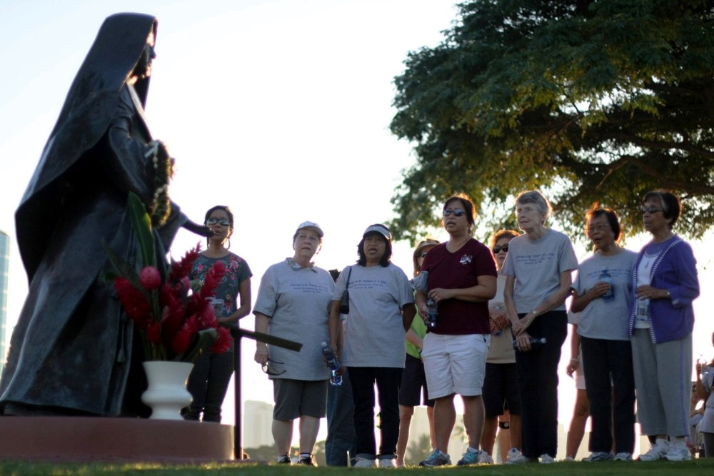 About 100 people participated in the inaugural St. Marianne Cope Charity Walk, organized by the St. Francis Healthcare System of Hawaii, Jan. 18. Participants began the two-mile trek with morning warm-up exercises, right, before walking or jogging from Kakaako gateway park to Kewalo Basin and back. A few stopped at the statue of St. Marianne in Kewalo to sing hymns and offer prayers to the Franciscan nun. Proceeds from the charity walk will go to St. Francis Healthcare programs and services. (HCH photos | Darlene Dela Cruz)