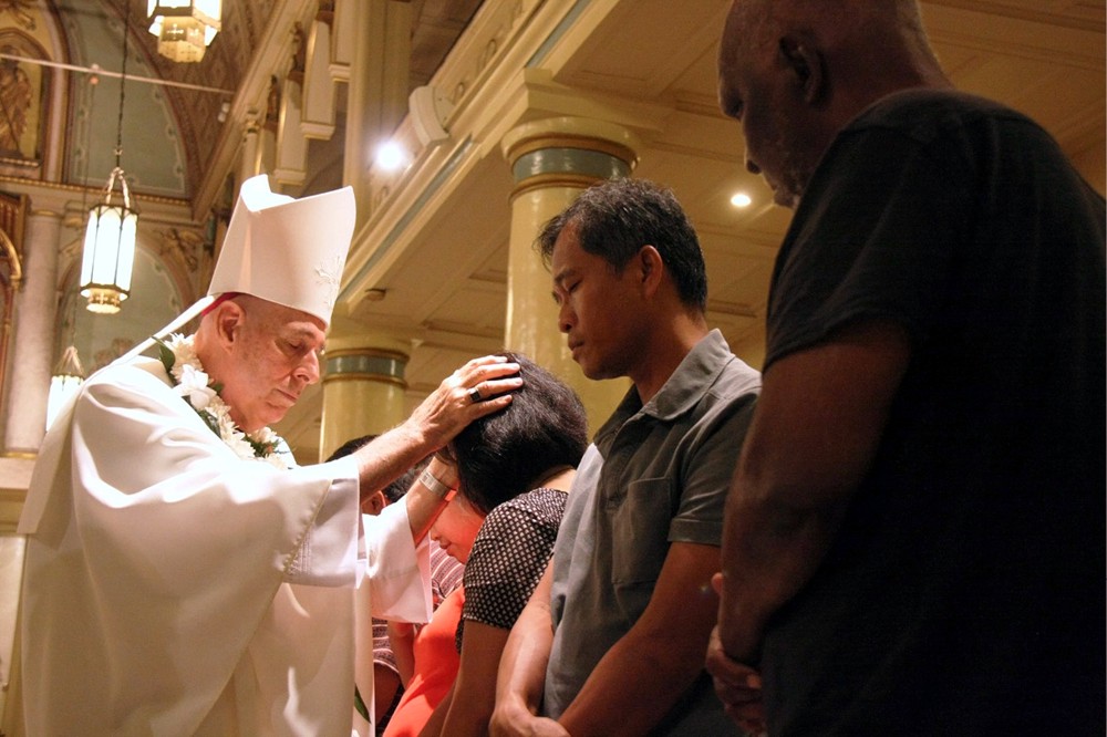 Several dozen faithful gathered at the Cathedral of Our Lady of Peace Feb. 11 for a special Mass commemorating the World Day of the Sick. Bishop Larry Silva laid hands on a parishioner during the liturgy as he administered the sacrament of the Anointing of the Sick. (HCH photo | Darlene Dela Cruz)