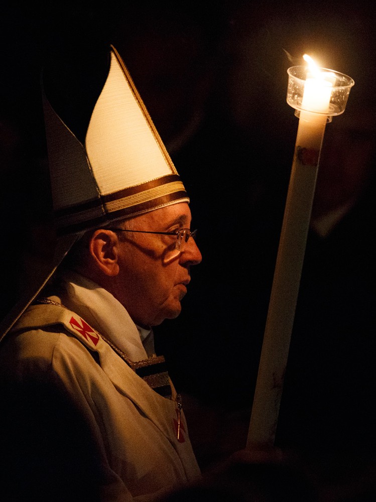 His Easter Vigil began with the lighting of the fire and Easter candle in the atrium of the basilica; walking behind the Easter candle and carrying a candle of his own, Pope Francis entered the darkened basilica. In the silence and solemnity of the moment, very few pilgrims and tourists disturbed the atmosphere with their camera flashes.