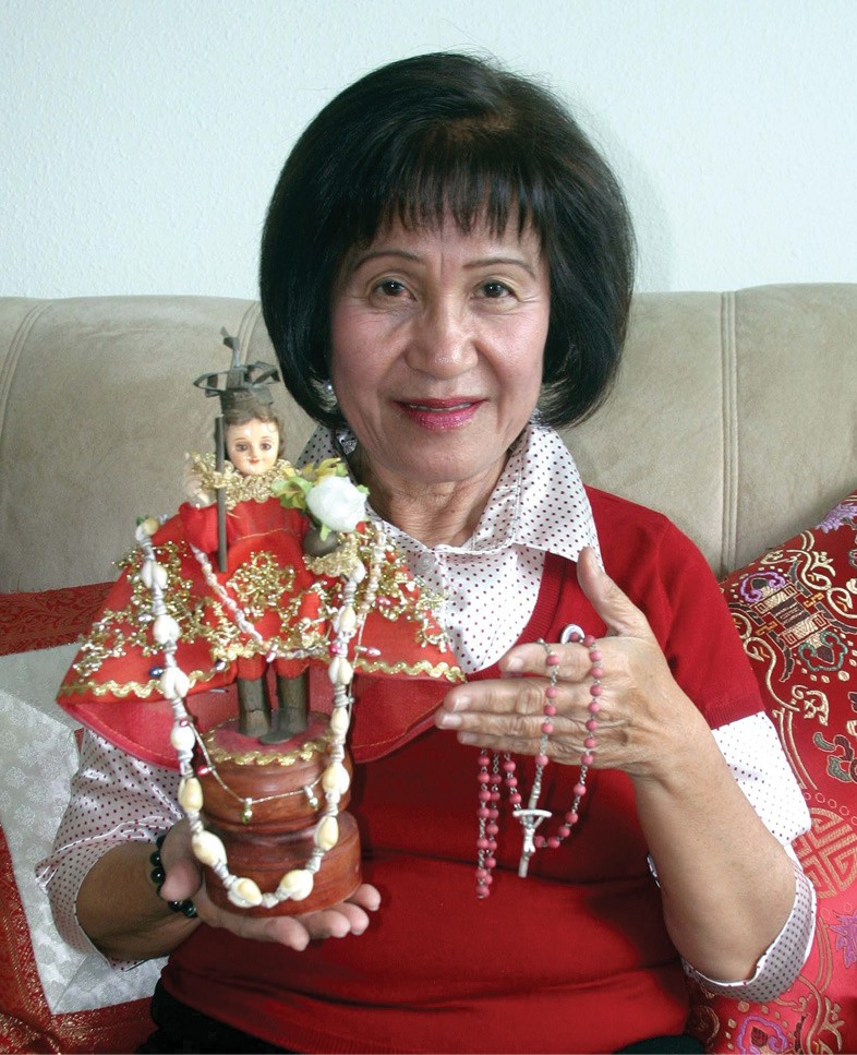 A petite woman who speaks with bright enthusiasm, Carbullido said she prays the pope’s rosary every day and has never been sick since that encounter. She is pictured here in her home with her Santo Nino statue and the pope’s rosary.