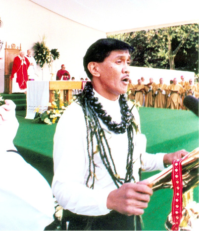 But later at the general audience, the group, wearing muumuus and aloha shirts and bearing leis and gifts for the Holy Father, was given special treatment. They were up front in the audience hall, allowing a close encounter with the pope, to shake hands, exchange words and give him an ukulele and a calabash, carried by Bevins, holding a pineapple, macadamia nuts, Kona coffee and other Hawaiian goodies.