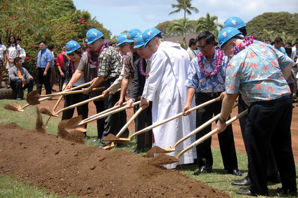 Bishop Larry Silva, center, joined Damien Memorial School president Bernard Ho, to his right, and other special guests at a groundbreaking ceremony at the Kalihi campus, April 30. Construction is slated to begin soon on the Clarence T.C. Ching Athletic Building, the first major complex to be built at the school in about 30 years. ( HCH photo | Darlene Dela Cruz)