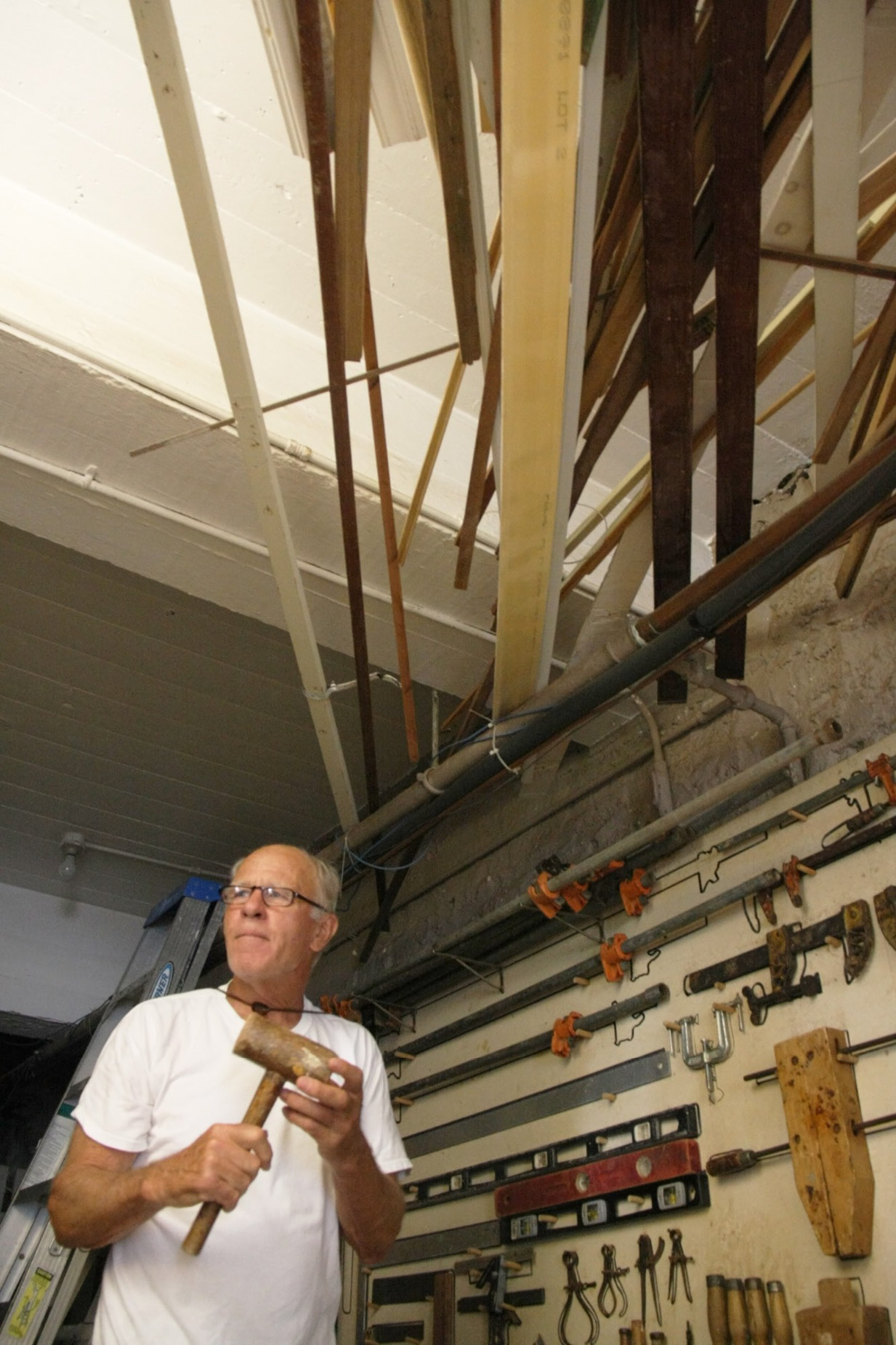 On one wall is his collection of tools, mostly old-school stuff: hand drills, hammers, chisels, clamps of every size, each in its properly outlined hanging place.