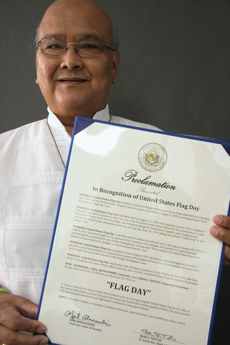 Deacon Kin Borja, district manager of Hawaii’s Knights of Columbus, displays a proclamation issued June 12 by Gov. Neil Abercrombie and Lt. Gov. Shan Tsutsui in recognition of U.S. Flag Day, June 14. The proclamation commends the role of the Supreme Council of the Knights of Columbus in petitioning President Dwight D. Eisenhower in 1952 to add the phrase “under God” to the Pledge of Allegiance to the Flag. The president signed a joint congressional resolution doing just that on Flag Day, June 14, 1954. (HCH photo by Darlene Dela Cruz)