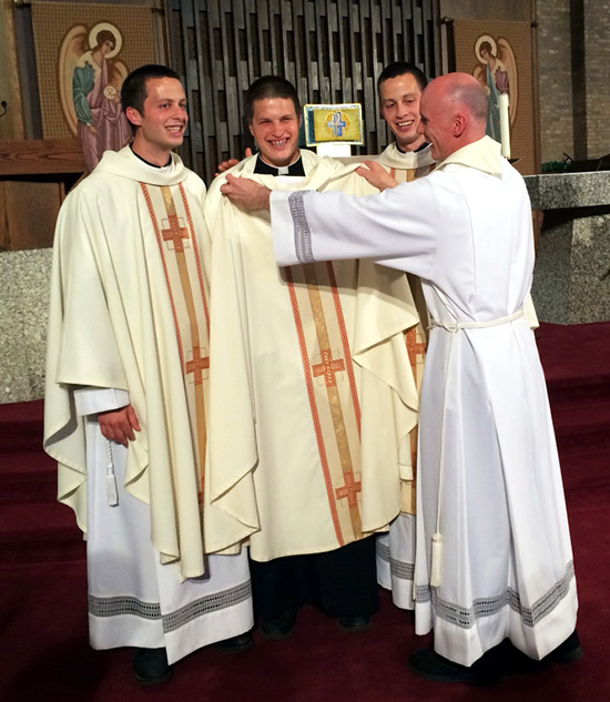 Father John Linden, vocations director for the Lansing diocese, can’t resist a playful moment after the ordination Mass of Father Todd, left, and Father Gary Koenigsknecht, holding a chasuble up to their 19-year-old brother, Lee, who just finished his first year of seminary. (Photo courtesy of Christina Capecchi)