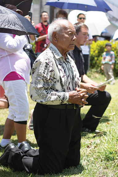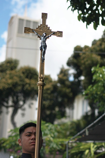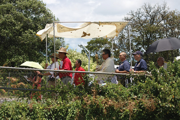 Dozens of faithful trekked from the Co-Cathedral of St. Theresa to the Cathedral of Our Lady of Peace June 22 for the annual Eucharistic procession commemorating the feast of Corpus Christi. Bishop Larry Silva, in the above photo with Deacon Keith Galang, led the procession, taking turns with other clergy holding the Eucharist encased in gold monstrance throughout the 1.25-mile procession. Procession participants stopped at various sites along the way to pray and sing hymns. (Photos by Darlene Dela Cruz)