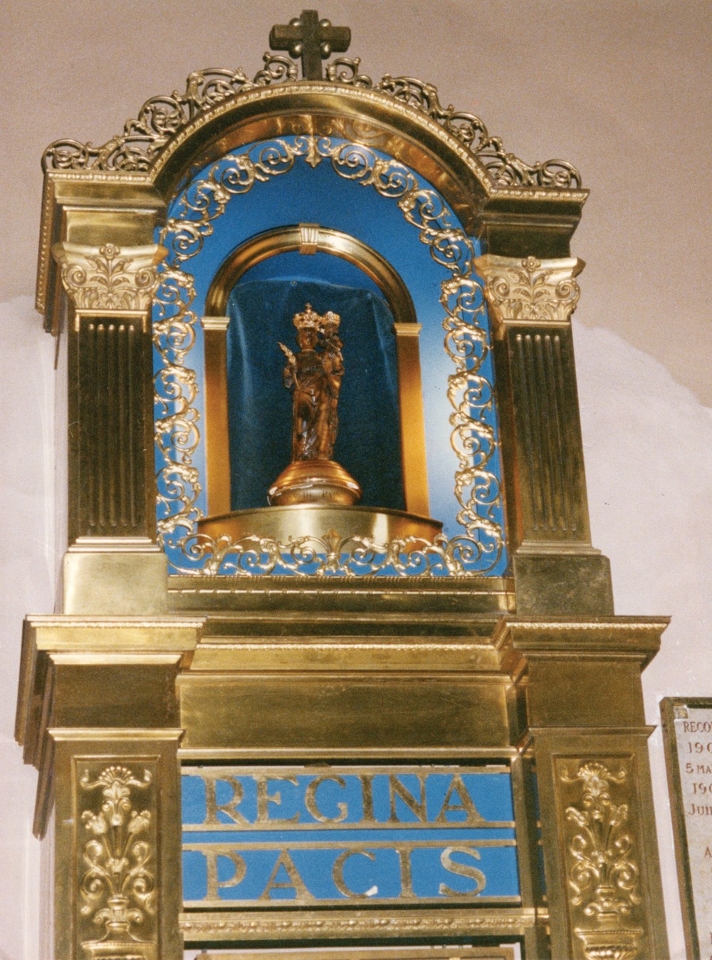 In 1954, during the Marian Year, another honor was bestowed on her. Our Lady of Peace, along with Our Lady of the Miraculous Medal, both from Paris, were privileged to join the assembly of “crowned Virgins” of the world in a celebration at St. Peter’s Basilica in Rome. Today the little Madonna continues to stand tall in a high niche of an elaborate shrine in the convent chapel on Rue de Picpus (Picpus Street) in Paris.