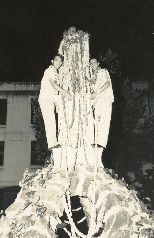 This article’s author, left, and a friend decorating Honolulu’s statue of Our Lady of Peace on the eve of her feast, probably around 1950.