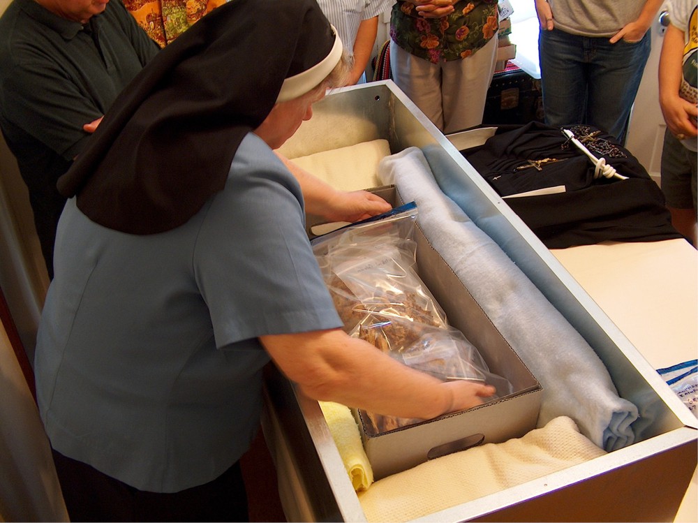 A full Franciscan black and white religious habit of the kind St. Marianne would have worn was then placed on top of the contents. A fifth blanket was laid over the habit and the metal box was covered with a sheet of galvanized metal held in place by four screws. It was later completely soldered shut.