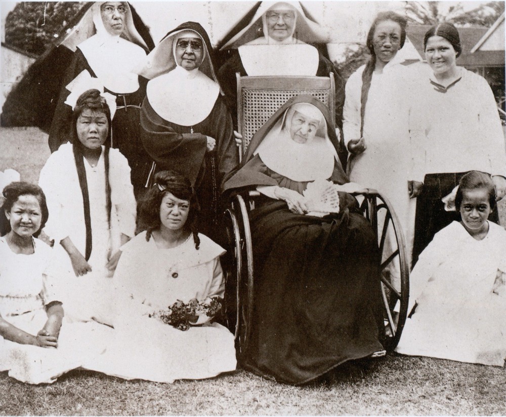 Mother Marianne Cope in a wheelchair poses for a photo with some of the women and Franciscan Sisters of Bishop Home, Kalaupapa, in 1918, shortly before her death.