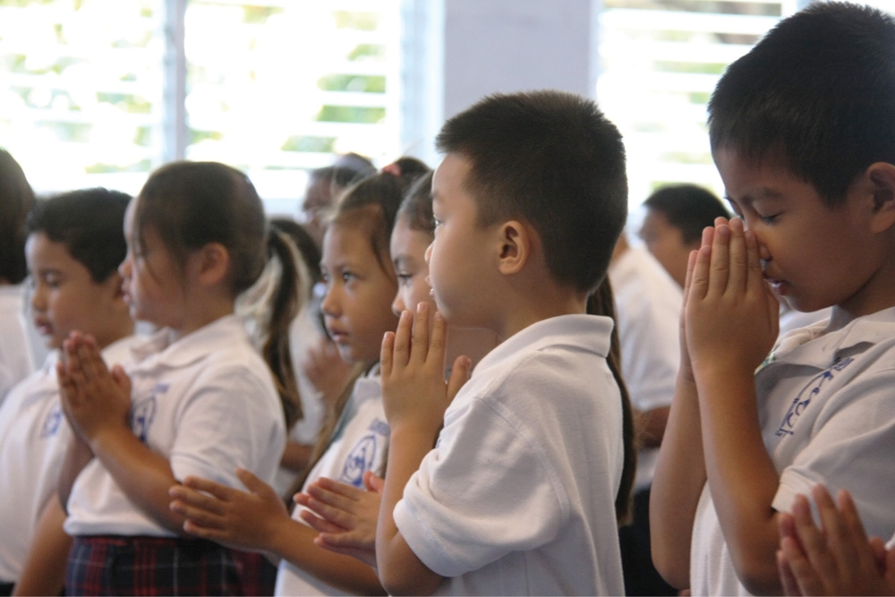 Students and teachers at Cathedral Catholic Academy in Honolulu ring in the start of the 2014-2015 school year with prayer, music and a festive assembly, July 28. The school begins a new “project-based” curriculum this year. (HCH photos | Darlene Dela Cruz)