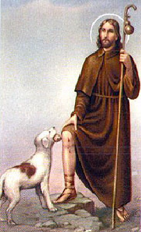 The saint shown here is often depicted in art with a dog at his side. His feast day is Aug. 16. What is his name?