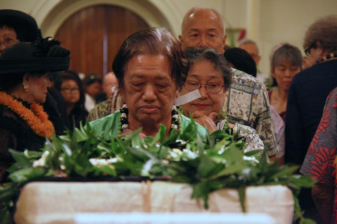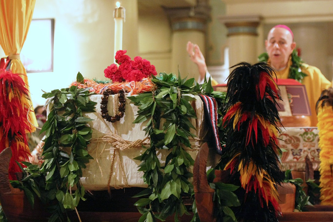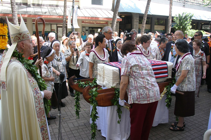 After a formal greeting outside the cathedral by the bishop and diocesan canonical officials, the box, wrapped in white tapa burial cloth and draped with a traditional Hawaiian quilt decorated with a Hawaiian flag pattern, was carried by four Franciscan sisters into the church on a canoe-shaped platform made of koa wood.