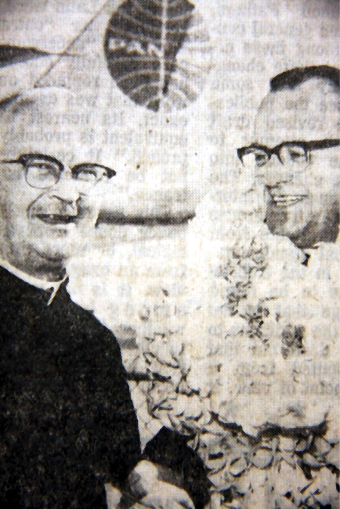 Left, Father Lawrence Mann, S.M., former assistant pastor of Holy Family Church, returned to Honolulu and to his new duties as assistant pastor of Holy Family. Father Mann (right) was met by the present pastor, Father Joseph Sherry, S.M. Father Mann has been in Carmel, California, the past two years. (Photo by Pan Am)