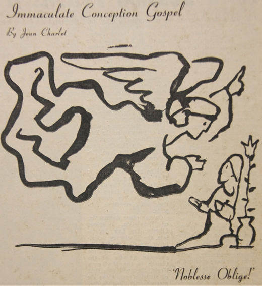 A cartoon by artist Jean Charlot (who lived in Hawaii from 1949 to his death in 1979) titled “Immaculate Conception Gospel.”
