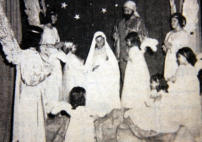 This Nativity scene brought to an inspiring close the four-act Christmas drama by the well-known English author Robert Hugh Benson presented at Sacred Hearts Academy on Sunday. Songs by the Choristers and Christmas numbers by grade school pupils proved delightful intermissions. Our Blessed Mother was portrayed by Esther Pfunter and St. Joseph by Patricia Coiner. The angels were Sandra Nishimura (kneeling) and (left to right) Sandra Lamansky, Bonnie Cullen, Kimberly Buckman, Rosanna Lambert, Elnette Like, El Nora Nobriga, and Alvina Hinch.