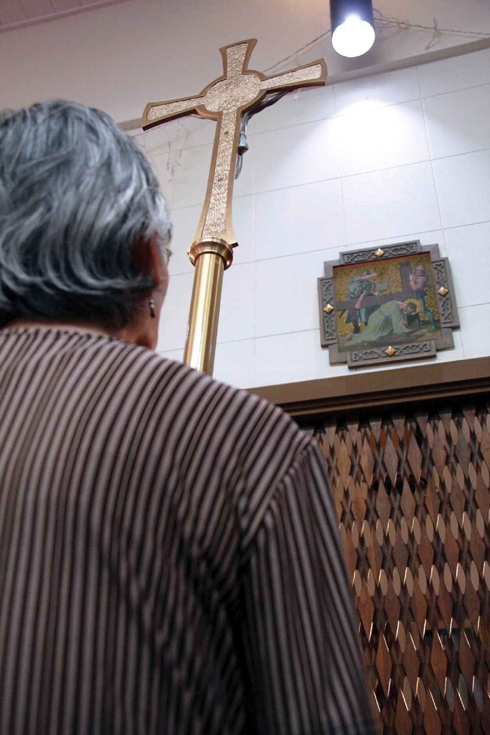 A parishioner at St. Anthony Church in Kalihi holds a crucifix during the Stations of the Cross, March 6. (HCH photo | Darlene Dela Cruz)