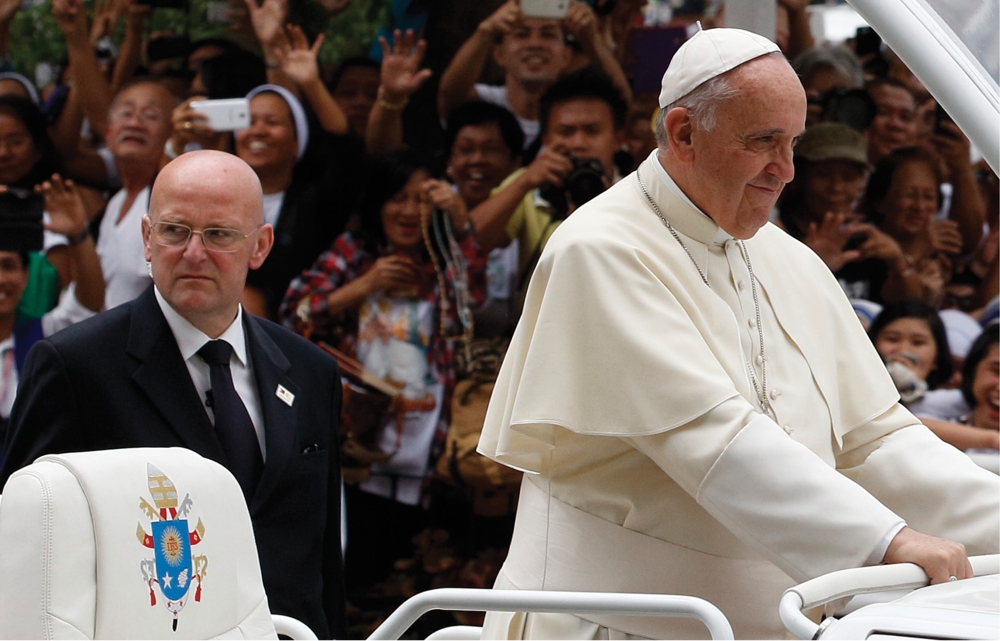 Domenico Giani, commander of the Vatican police force, keeps watch as Pope Francis arrives to celebrate Mass with bishops, priests and members of religious orders in the Cathedral of the Immaculate Conception in Manila, Philippines, in this Jan. 16, 2015, file photo. Giani said that he is not aware of any plans to attack the Vatican or the pope although Islamic State militants have made general threats. (CNS photo/Paul Haring)