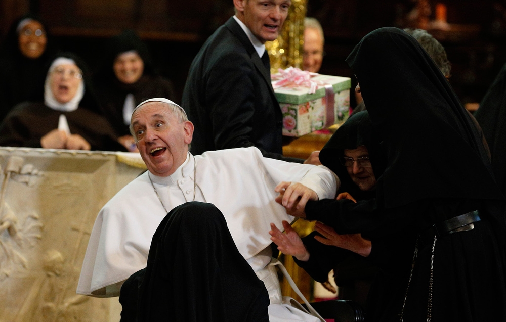 The nuns, who had been seated in the sanctuary, broke free, running to the pope, surrounding him, hugging him, kissing his ring and piling gifts on his lap.