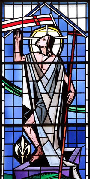 In which Oahu church can you find the modern stained glass window of the resurrected Christ shown in the photo?