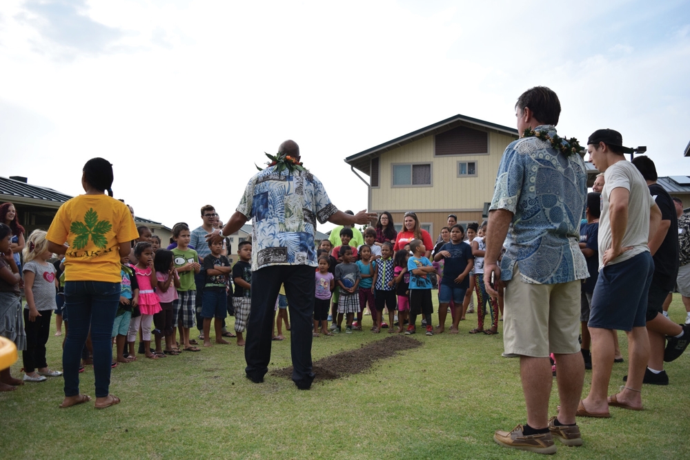 Kahu Brian Broshard leads the blessing for the soon-to-be-built playground at its groundbreaking ceremony Feb. 25 at The Homes at Ulu Wini in Kailua-Kona. The $180,000 Miracle Mega Tower was made possible by a donation from the Roberts Foundation. The play structure will feature double-deck tower and water fountain, spiral and wave slides, a fish bridge, play panels, stairs,
