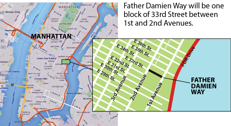 New York City will name one block of 33rd Street, between 1st and 2nd Avenues on Manhattan’s southeast side as “Father Damien Way” on May 11. Two patients from Kalaupapa will be among the Hawaii guests attending the dedication ceremonies.
