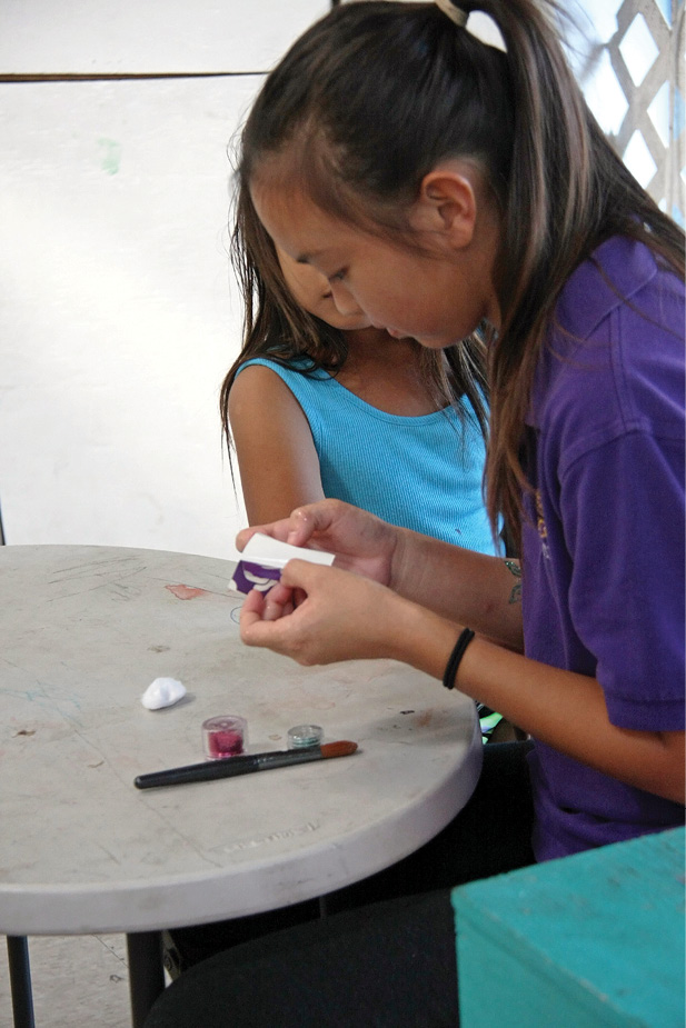 Scholarship recipient Kacie Kimoto, a Damien sophomore, decorated the tiny arms of children with shiny “glitter tattoos.”