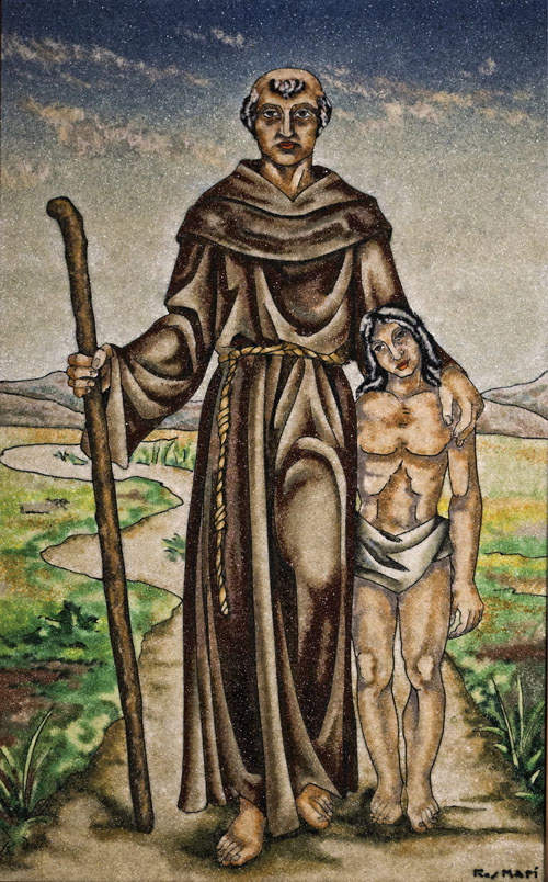 Blessed Junipero Serra is depicted with a California Indian in a painting in early May at Mission San Fernando Rey de Espana in Mission Hills, Calif. (CNS photo/Nancy Wiechec)