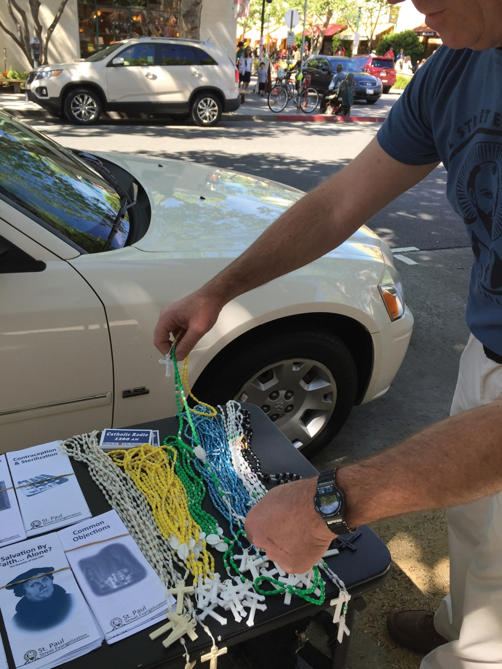 And two members of the Berkeley chapter of the St. Paul Street Evangelists make the personal pitch. “Would you like some rosary beads?” they ask a woman who slows down to eye the table.