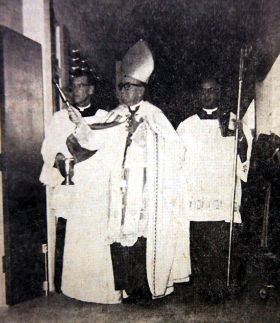 In ceremonies last Sunday, His Excellency the Most Reverend Bishop James J. Sweeney, Bishop of Honolulu, blessed the new St. John Vianney School in the Keolu Hills-Enchanted Lakes area of Kailua. It is the third windward Catholic school and the 20th Oahu school. Assisting the Bishop was the Very Reverend Monsignor Charles A. Kekumano, Chancellor (right) and Fr. John B. Read, pastor of St. John Vianney Parish. (Herald Photo)