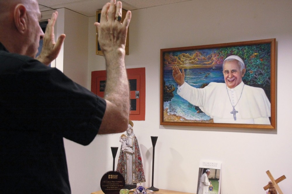 Bishop Larry Silva blesses a painting of Pope Francis in the downtown Honolulu chancery lobby, Oct. 27. The oil painting was done by local artist J.G. De Silva, a Catholic, who said she was “inspired by the Holy Spirit” to create the artwork in homage to Pope Francis’ environmental encyclical, “Laudato Si’.” The painting, which took three months and “a lot of research” to complete, highlights the pope surrounded by endangered Island creatures such as the nene goose, monk seal and Hawaiian butterfly. De Silva has also painted several works depicting St. Damien De Veuster and St. Marianne Cope, which can be seen as well at the chancery and in the Cathedral Basilica of Our Lady of Peace gallery shop. (HCH photo | Darlene Dela Cruz)