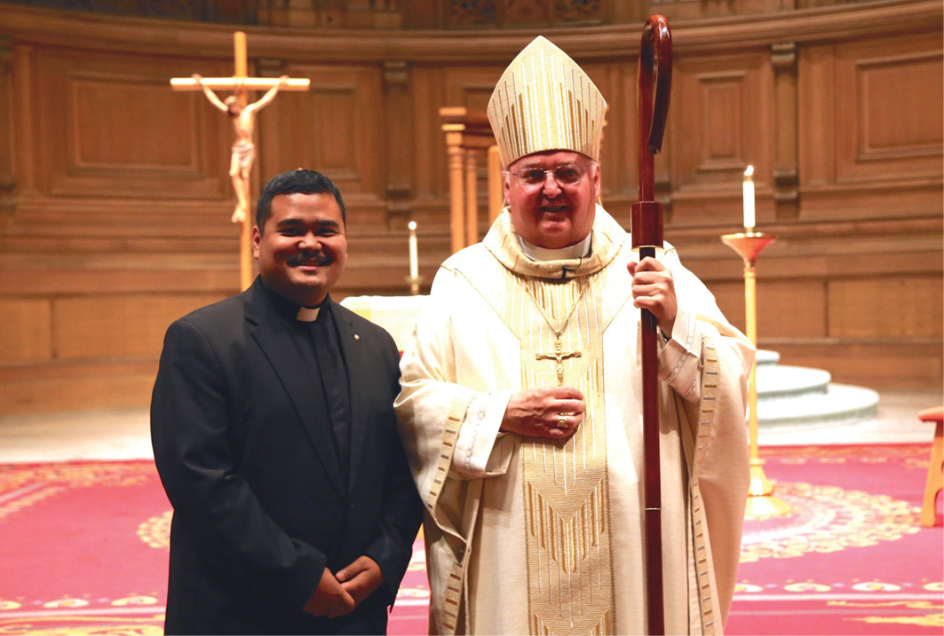 Hawaii seminarian Alfred Guerrero stands by Bishop Patrick McGrath of the Diocese of San Jose who presided at Guerrero’s Rite of Candidacy Mass Nov. 10, at St. Patrick Seminary in Menlo Park, Calif. During the ceremony, members of the seminary class of 2017 declared their intentions to become candidates for the priesthood. Guerrero is a parishioner of the Co-Cathedral of St. Theresa in Honolulu. (Photo courtesy of John Villa, Diocese of Oakland, Calif.)
