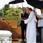 Papaikou-native Maryknoll Father Clyde Phillips presides at the burial Feb. 17 of his mother Catherine Priscilla Vicente Phillips at Alae Cemetery on the Big Island. Catherine Phillips died on Feb. 8 at age 89. Maryknoll’s U.S. regional superior Father Kevin Hanlon, left, came to Hawaii for the funeral. Father Phillips had recently moved back to the Big Island to care for his ailing mother. (Photo courtesy of Sister Malia Dominica Wong, OP)