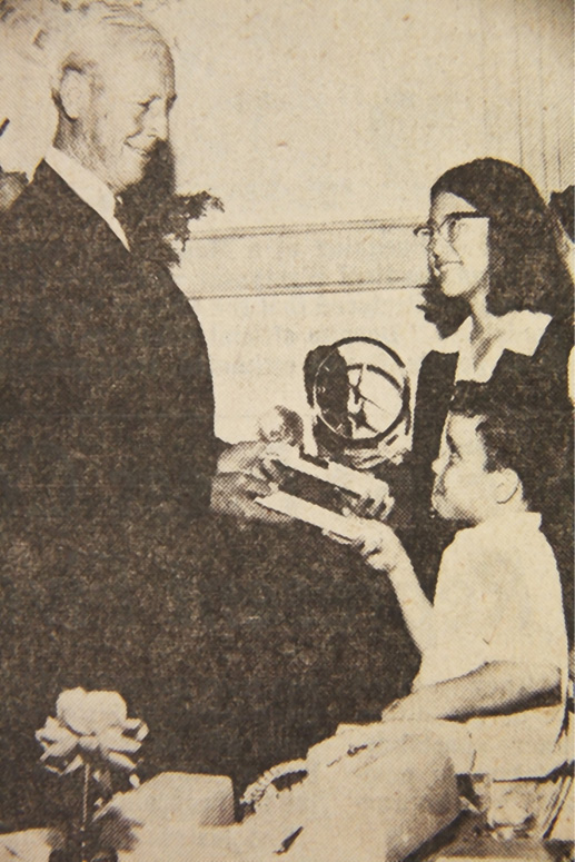 Maryknoll Grade School students Daniel Druecker and Diantha Goo receive Governor Burns’ congratulations as the Building Fund Drive for the new school at Maryknoll gets under way. The children are selling the World’s Finest Chocolate. (Craig Stevens Photo)