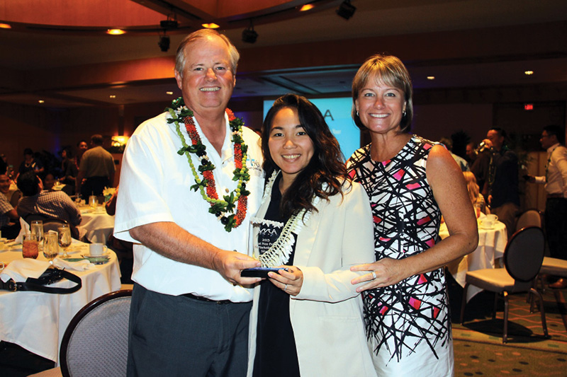 Hawaii Catholic Schools superintendent Michael Rockers stands with Catholic schools communications/marketing specialist Deborah Manog, center, and Melinda Mullis of Orangeroc at the American Marketing Association Hawaii Chapter awards luncheon at Hawaii Prince Hotel, April 7. (Photo courtesy of Hawaii Catholic Schools)
