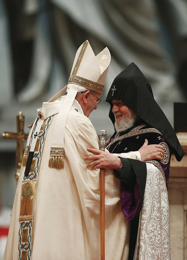 Pope Francis embraces Catholicos Karekin II, patriarch of the Armenian Apostolic Church, during a 2015 Mass in St. Peter’s Basilica at the Vatican to mark the 100th anniversary of the Armenian genocide. Ecumenical relations, the memory of past suffering and prayers for a future of peace form the framework for Pope Francis’ itinerary when he visits Armenia June 24-26. (CNS photo/Tony Gentile, Reuters)