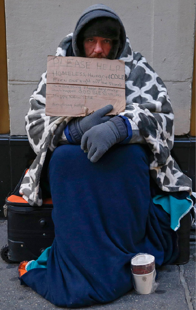 A man holding up a sign stating he is ‘homeless, hungry and cold’ sits along the sidewalk in New York Jan. 8. Under an umbrella organization called Circle of Protection, more than 100 Christian faith leaders want any and all presidential candidates, but especially “major” candidates, to make poverty a priority throughout the 2016 election campaign. (CNS photo/Shannon Stapleton, Reuters)