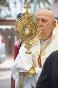 - Father Gregorio Honorio, co-cathedral pastor, holds the monstrance in downtown Honolulu.